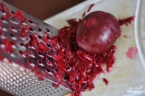 1. Моем свеклу и отправляем ее в кастрюлю с водой, варим до полной готовности (проверяем вилкой). Примерно через 1-1,5 часа свекла готова, очищаем ее от кожуры и измельчаем на крупной терке.