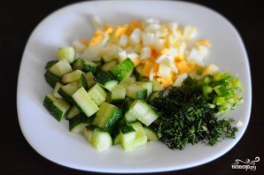 2. Отвариваем яйца, после чего нарезаем их кубиком. Моем и нарезаем свежий огурец кубиком, моем и нарезаем зелень и лук.