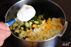 3. Все ингредиенты отправляем в большую кастрюлю, чтобы удобно было мешать, солим по вкусу и добавляем сметану.