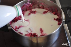4. Добавляем в кастрюлю весь кефир. Если видите, что масса очень густая, то добавляем немного холодной очищенной воды.