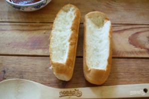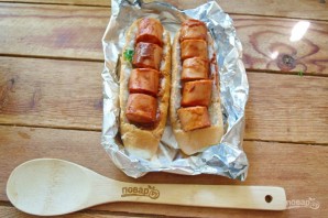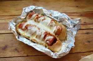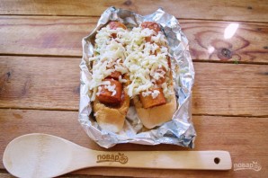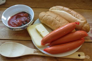 Для приготовления блюда возьмите: несколько булочек для хот-догов, сосиски, соус томатный "Барбекю", соевый соус, твердый сыр, сливочное масло, зелень, чеснок, соль, специи.