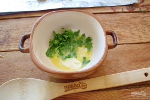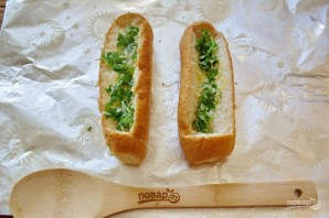 Сливочное масло смешайте с выдавленным через пресс чесноком и рубленой зеленью. Прогрейте в микроволновке. Полученной жидкой массой смажьте внутреннюю часть булочек.
