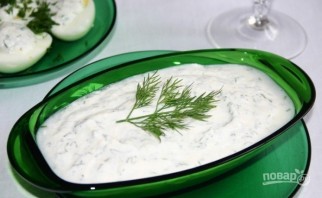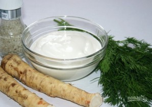 1. Такой соус на основе хрена готовится с добавлением сметаны и укропа. Сметану лучше брать 15%, чтобы соус не был слишком густым.