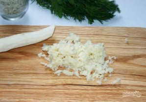 2. Берем хрен, очищаем его и мелко крошим ножом. Можно натереть его на мелкой терке.