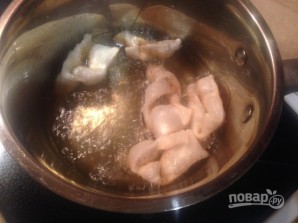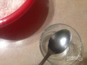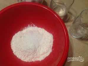 Водку выливаем в воду, получившийся раствор добавляем к муке.