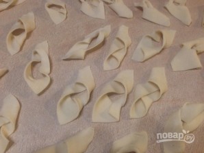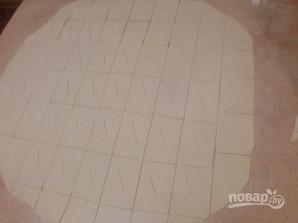 Оставим тесто минут на 10-15 в пакете, пусть отдохнет. А затем как можно тоньше раскатаем в пласт. У меня получился почти круг диаметром около 40 см. Нарезаем на небольшие прямоугольники с прорезью посредине.