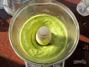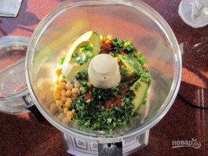 2. Затем в блендер выложите очищенный авокадо (нарезанный произвольными кусочками), нарезанную зелень, нут, соус, тахини, соль, сок и перец.