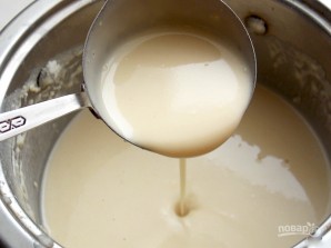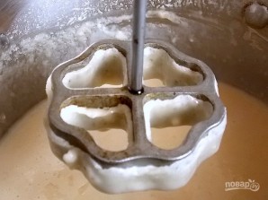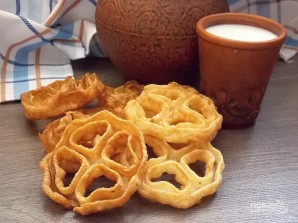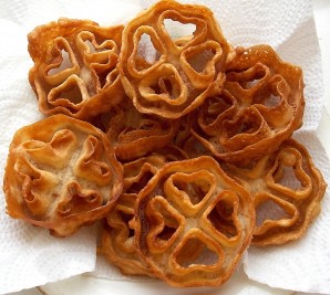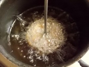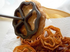 В глубокую, но не большую по диаметру, сковороду влейте растительное масло, поставьте в него форму для хвороста и прогрейте масло. Затем выньте форму и опустите ее в тесто, не доходя до края формочки.
