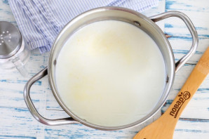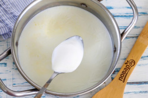 Фермерское молоко перелейте в кастрюлю или казан, поместите емкость на плиту и доведите жидкость до кипения. Тщательно следите за молоком, так как оно резко выкипает и выливается за край. Выключите нагрев и вынесите емкость на холод, чтобы молоко остудилось до 35 градусов.