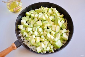 2. Порежьте мелко лук, обжарьте пару минут на растительном масле. Молоденькие кабачки порежьте кубиками, если кожура жесткая, то очистите ее. Добавьте к луку, жарьте 10 минут, посолите.