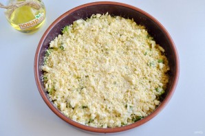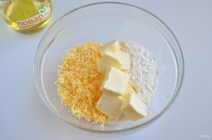 3. Приготовьте штрейзель: соедините муку, тертый сыр, холодное сливочное масло. Хорошо перетрите всё в мелкую крошку и уберите на 5-7 минут в морозилку.