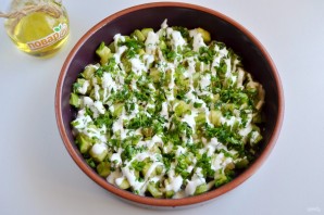 4. Переложите овощи в огнеупорную тару для запекания, добавьте любимых специй, если хотите. Полейте сметаной, посыпьте рубленной зеленью.
