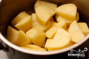 1. В первую очередь промываем картофель, затем его очищаем и довольно крупными кусочками нарезаем. Ставим вариться в кастрюле, воду немного надо подсолить.