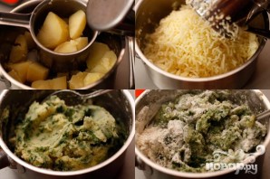 2. Теперь из сваренного в подсоленной воде картофеля мы делаем пюре. В пюре разбиваем яйцо, добавляем муку и шпинат. Все хорошенько перемешиваем, у нас должна получиться однородная масса. При использовании свежего шпината, его необходимо побланшировать минуты одну-две в кипящей воде, после чего мелко нарезать. Замороженный шпинат надо просто вынуть из морозилки и разморозить.