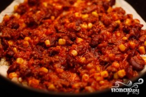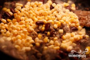 3. Нарезаем мелко перец чили и приправляем фарш. Вареную фасоль и кукурузу вместе с фаршем кладем в сковороду, перемешиваем и жарим минуты 2-3.