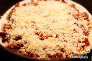 5. Теперь смазываем маслом сковороду и кладем на нее тортилью. Измельченный сыр посыпаем сверху. Затем выкладываем мясную начинку. Посыпаем еще раз сыром и накрываем тортилью.
