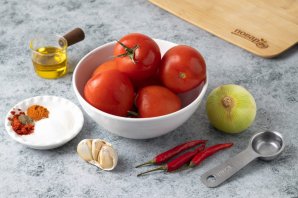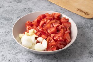 Помидоры помойте, удалите сердцевину и нарежьте крупными ломтиками. Перец чили разрежьте пополам и удалите семена с хвостиком. Чеснок и репчатый лук очистите от шелухи, нарежьте на небольшие ломтики.