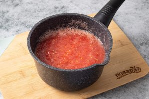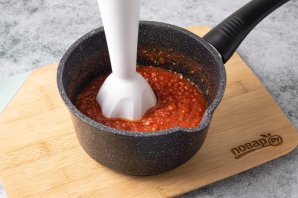 Когда масса заметно уварится в 2-3 раза, после пробейте погружным блендером массу. Затем протрите через сито, чтобы добиться однородной гладкой консистенции.