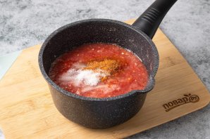 Добавьте все специи и соль. Доведите до кипения на среднем огне. Варите на медленном огне около 1 часа периодически помешивая.