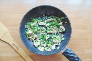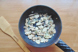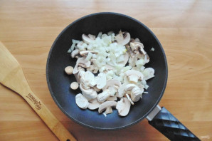 Тем временем приготовьте начинку для киша. Лук и шампиньоны нарежьте и выложите в сковороду.