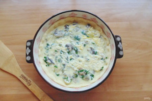Залейте начинку приготовленной смесью из яйца, сыра и сливок.