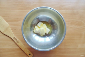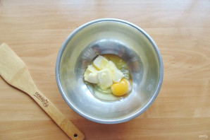 Приготовьте тесто для пирога. В миску выложите мягкое сливочное масло.