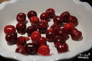 Форму для выпекания смазываем сливочным маслом. Вишню промываем и достаем из нее косточки.
