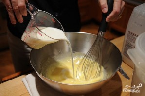 В удобной миске замешиваем тесто. Для этого при помощи венчика или блендера взбиваем яйца и муку. Добавляем сахар, разрыхлитель. Снова взбиваем и медленно вливаем молоко. Тесто должно получиться немного густоватым и гладким.