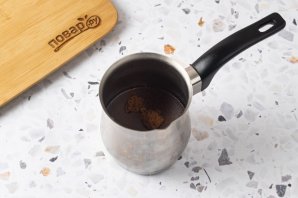Всыпьте молотый кофе в турку, влейте воду. На среднем огне доведите до кипения и проварите 2-3 минуты.