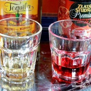 В отдельном стакане смешать текилу и апельсиновый сок. Получившуюся смесь залить в стакан с гренадином.