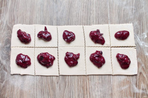 Слоеное тесто немного раскатайте в одном направлении и разрежьте на квадратики. Выложите на середину каждого квадрата джем.