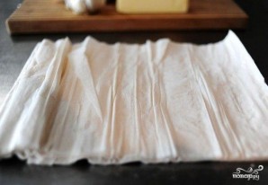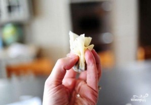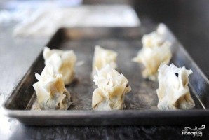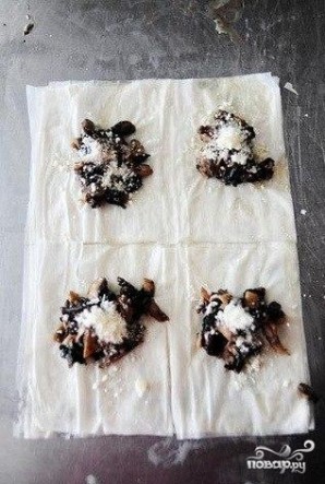 Слой теста разрезать на 4 равные части и слегка смазываем маслом. В серединку каждого квадрата кладем начинку.