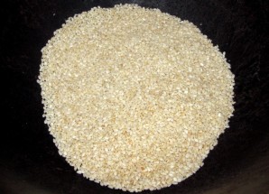 Итак, для начала ставим сухую сковороду на огонь и нагреваем ее. Выкладываем на сковороду кунжут и обжариваем его немного.