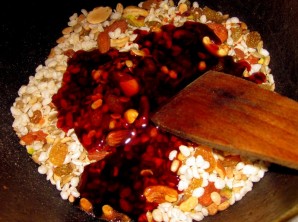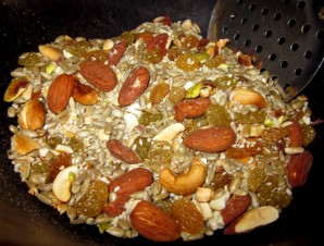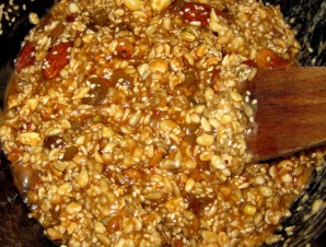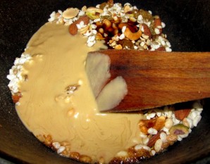Добавляем к кунжуту орехи и сухофрукты, а также воздушный рис, перемешиваем все и пару минут жарим, чтобы орешки подсохли.