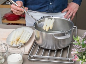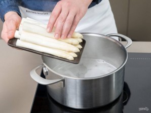 2. В большой кастрюле доведите до кипения вино, воду, соль, сахар и сок лимона. Затем в кипяток опустите спаржу. Варите её в течение 8 минут.