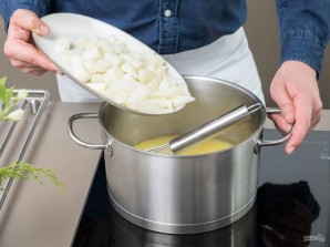 4. После этого в кастрюле растопите масло. Обжарьте в нём лук в течение одной минуты с мукой. Далее влейте бульон из-под спаржи, и добавьте сам овощ. Варите суп ещё 10 минут.