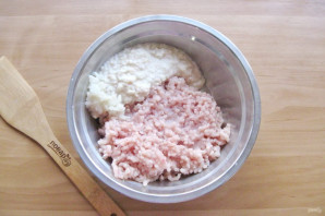 Лук и чеснок очистите, помойте. Белый батон или булку залейте холодной кипяченой водой и дайте постоять несколько минут. После воду отожмите. Пропустите через мясорубку лук, чеснок и батон.