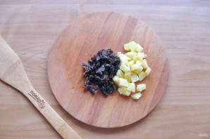 Чернослив помойте, залейте кипятком и дайте набухнуть в течение 10 минут. После достаньте из воды и мелко нарежьте. Яблоки помойте, очистите, удалите сердцевину и нарежьте небольшими кубиками.