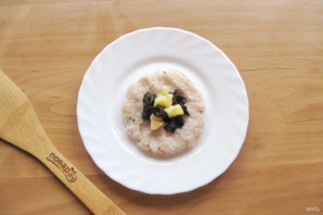 Из порции фарша сформируйте лепешку, на середину которой выложите яблоки с черносливом.