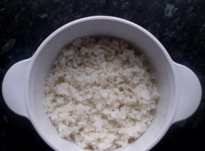 Рис отварите до готовности, затем откиньте на дуршлаг и промойте водой.