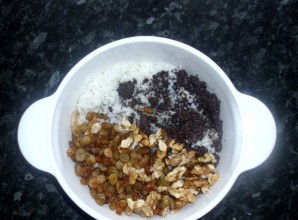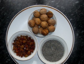 Мак и изюм запарьте в горячей воде на 15-20 минут. Орехи очистите от скорлупы.