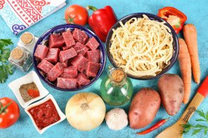 Идеально для обеда. В лагман можно добавлять любые сезонные овощи, а вот из мяса обычно используется только баранина или говядина. Ещё один важный компонент — это лапша. Конечно лучше всего сделать лапшу самостоятельно, но если совсем нет времени, то возьмите магазинную, всё равно получится очень вкусно! Знаю, что многие готовят это блюдо и со спагетти, поэтому смело выбирайте любой удобный для вас вариант. Калорийность лагмана зависит от степени его густоты, ну и конечно самое калорийное в этом блюде — мясо баранины и лапша. Если вы на диете, то можете сократить количество этих продуктов в рецепте. Я и вовсе предлагаю заменить баранину говядиной, ведь говядина — это диетическое и нежирное мясо. Прекрасный вариант вкусного, питательного и полезного блюда для всей семьи