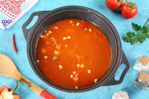 В конце добавьте нарезанный небольшими кубиками картофель, измельчённый чеснок, соль, кусочек горького перца без семян и специи по вкусу.