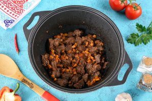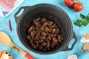 Разогрейте казан с маслом, выложите мелко нарезанный лук и обжарьте в течение 10 минут. Добавьте мясо и готовьте на сильном огне до испарения жидкости. Затем дайте мясу подрумяниться. Если мясо ещё жестковато, то добавьте немного воды и тушите до тех пор, пока оно не станет мягким.