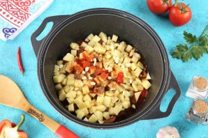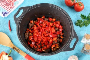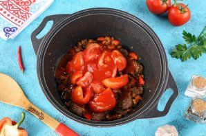 Помидоры ошпарьте кипятком, снимите кожицу и нарежьте дольками. Томатную пасту разведите в 100 мл. воды. Добавьте помидоры и томатную пасту в казан к мясу с овощами.