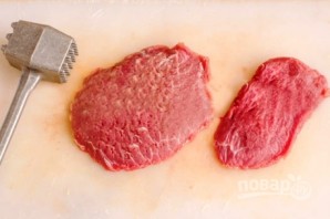 Нарезаем мясо говядины на ломтики толщиной 1-1,5 см и слегка отбиваем.