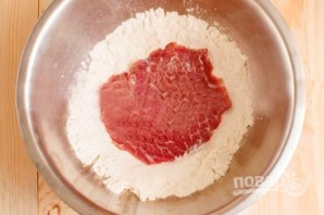 В миску добавляем муку, соль, черный молотый перец и хорошо перемешиваем. Затем каждый кусок мяса панируем в этой сухой смеси.