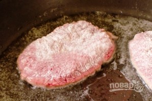 Отправляем говядину на разогретую с растительным маслом сковороду и жарим с обеих сторон по 3-4 минуты.
