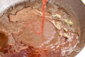 Убираем лангет со сковороды, а взамен выкладываем тимьян или чабер и наливаем вино. Выпариваем вино несколько минут, помешивая.