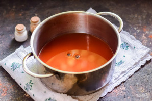 Томатный сок перелейте в кастрюлю, добавьте горошины перца.